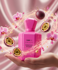 Maracuja Passion eröffnet mit der lebendigen Frische von Zitrone und Mandarine, begleitet von der prickelnden Würze des pinken Pfeffers und der fruchtigen Note der Maracuja. Im Herzen entfalten sich die zarten Blüten von Jasmin und Maiglöckchen, vereint mit maritimen und grünen Noten. Saftiger Pfirsich, Melone und süße Himbeere treffen auf die exotische Tiefe der Feige, abgerundet durch die warme Note von Ambra. In der Basis verleihen holzige Akkorde, sinnlicher Moschus und ein Hauch von Vanille und Karamell dem Duft eine köstliche, verführerische Tiefe. Ein Extrait de Parfum.